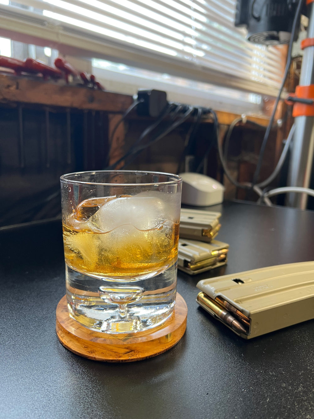 Handmade with American Oak, featuring a .223 inert round, a bullet, and a second casing end cut showing the primer. The Oak has been laser engraved with dimensional drawings and bullet specifications. Encased in high grade crystal clear epoxy resin with a non-slip cork bottom.